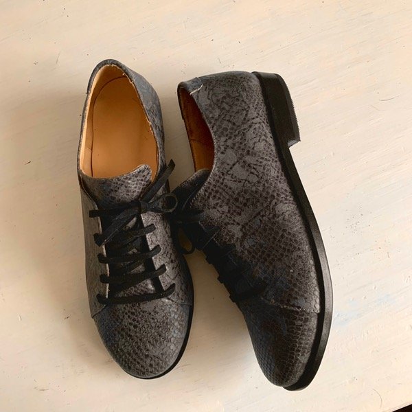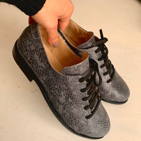 Acordonados 100% cuero en corte y forro. Cuero vacuno reptil grisado y lila, cordones de gamuza negra, taco 1 cm. Vira en color negro, suela de cuero con lustre y terminación en negro.