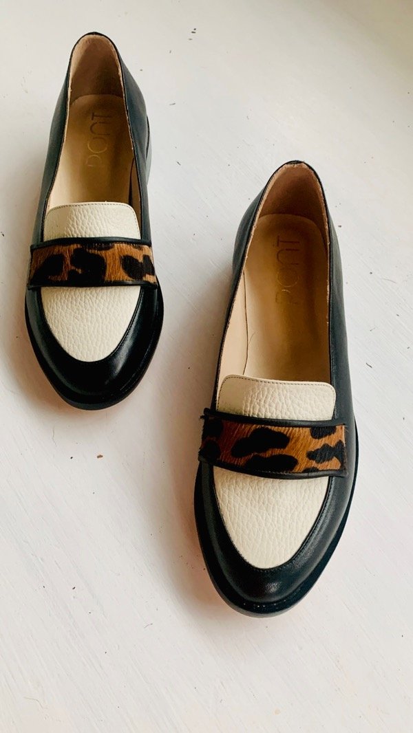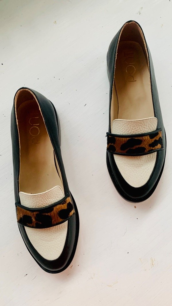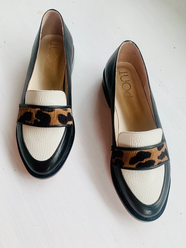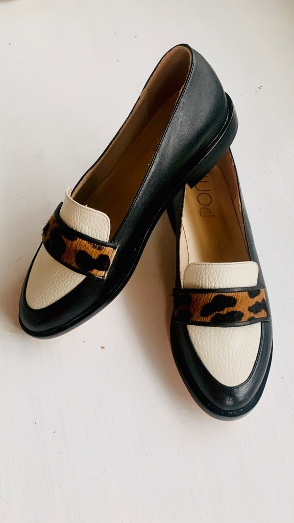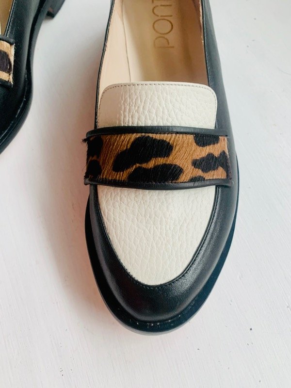 Hermoso mocasín combinado en cuero Vacuno negro y blanco + vincha en cuero animal print peludo! Taquito aprox de 1 cm. 100% cuero tanto en el corte como en el forro. Cómodos, para todos los días. La horma calza al talle habitual, en caso de estar 1/2 punto, consultar. Un poco de rock, un poco romántico.