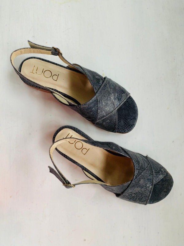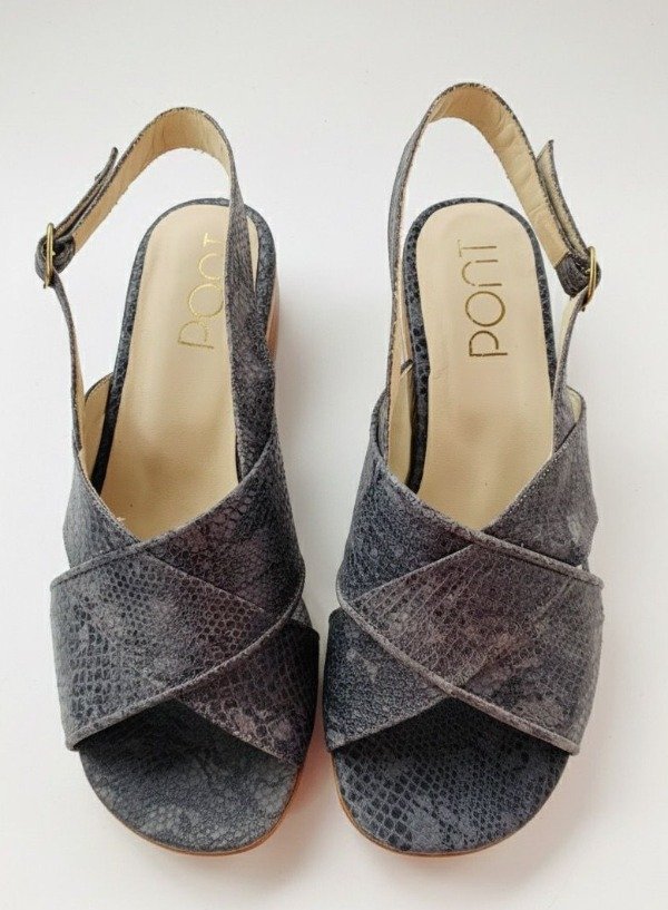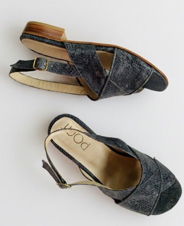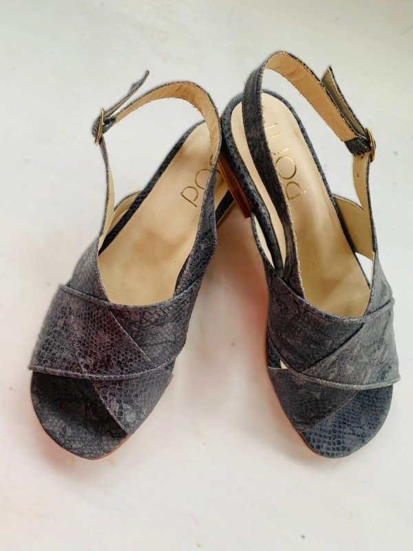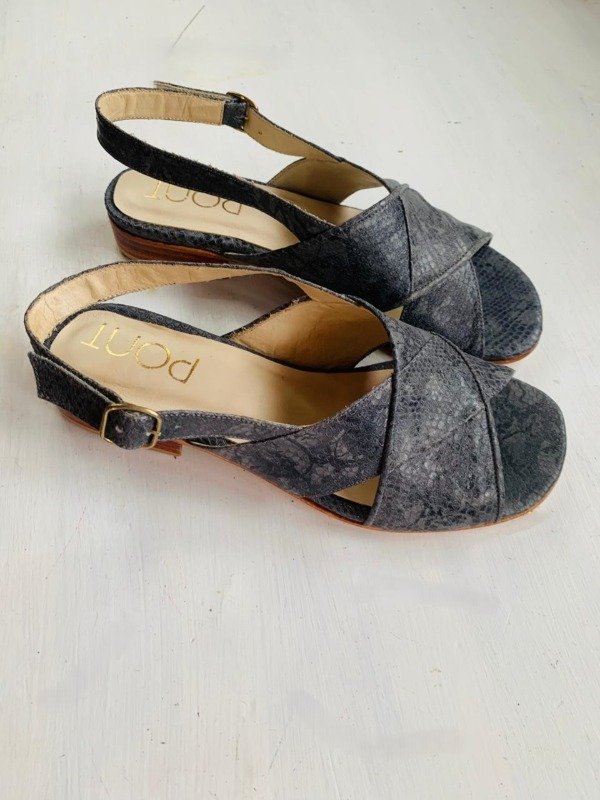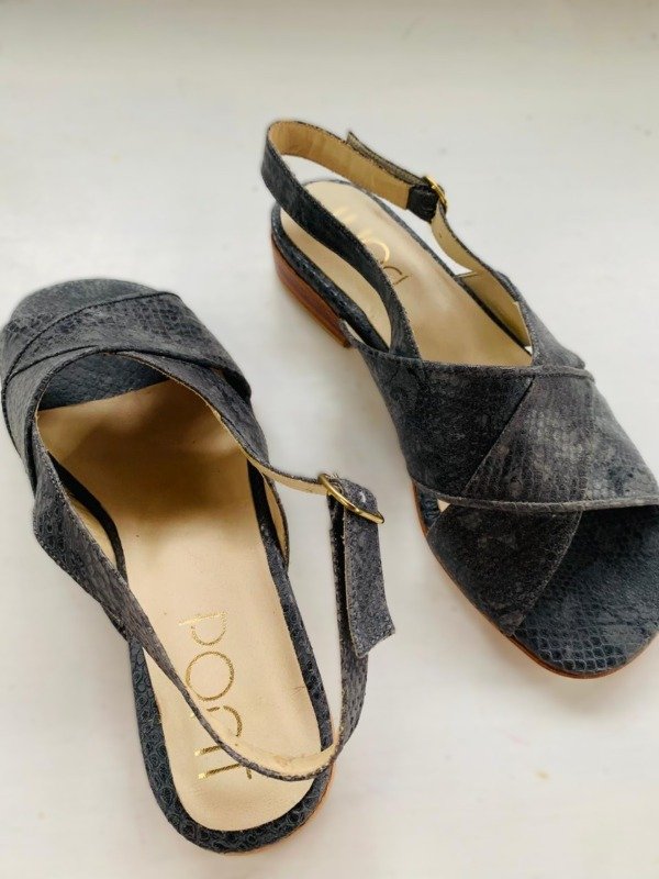 Hermosa sandalia de aprox. 2 cm de taco. Corte de cuero tipo reptil con una combinación entre negro y gris.